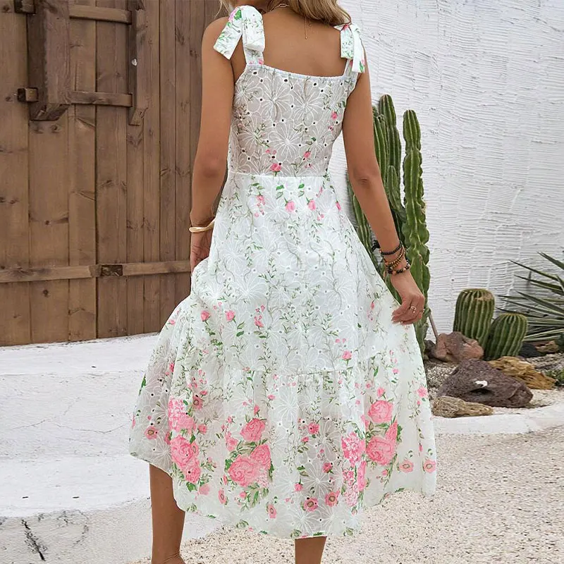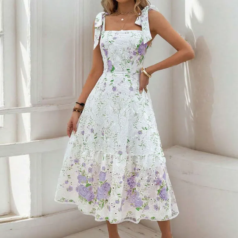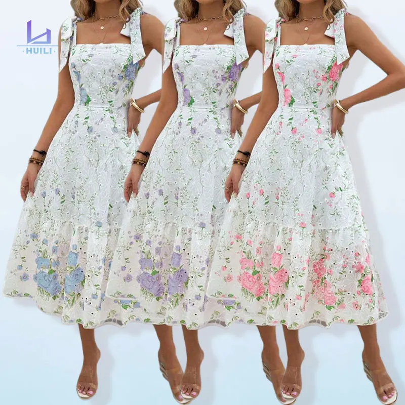 Huili Manufacturer Custom High Quality Tie Straps Boho Square Neck Lace Floral Cutouts Embroidered Designer Romantic Midi Dress